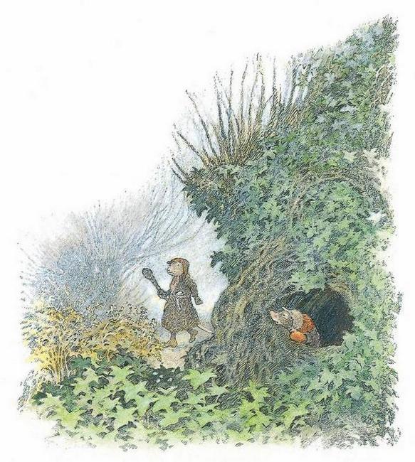 Ах, какой это был спектакль! Сонные звери, укрывшись от дождя и ветра, стучавших в двери, в своих уютных норках вспоминали ясные рассветы за час до восхода солнца, когда туман, ещё не успевший рассеяться, тесно прилегал к поверхности воды. Нырнёшь в холодную воду и бежишь по берегу, чтобы согреться. А вслед за этим появлялось солнце, и преображались земля, вода и воздух. Серое становилось золотым, и рождался цвет от того, что солнце снова с ними. Они вспоминали послеобеденную лень жаркого летнего полудня, когда можно было зарыться в густой травяной подлесок и чувствовать, как солнышко проникает туда маленькими золотыми пятнышками. А потом купание и катание по реке, прогулки вдоль пыльных улочек и по тропинкам среди спелой пшеницы. А после этого, наконец, – длинные вечера, когда завязывались ниточки добрых отношений, возникали дружеские связи, составлялись планы на завтрашний день. Было о чём поговорить в короткие зимние дни, когда звери собирались возле камина. Но у Крота всё-таки оставалась ещё горсточка свободного времени, и вот однажды, когда дядюшка Рэт, сидя в кресле возле огня, то задрёмывал, то пытался срифмовать слова, которые никак не рифмовались, он принял решение пойти самому и изучить Дремучий Лес и, может, завязать знакомство с Барсуком.