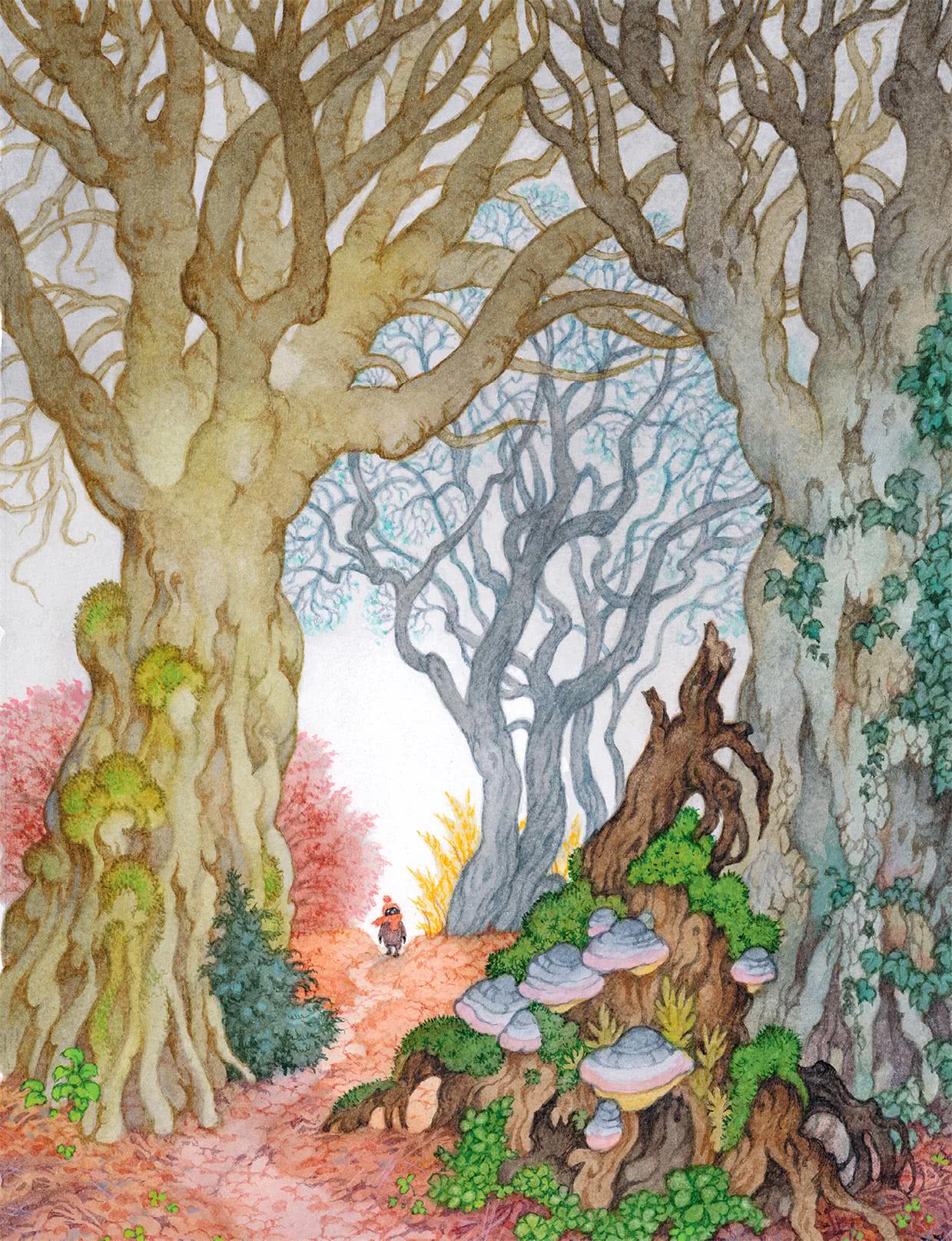 Крот, присев на корточки рядом с дядюшкой Рэтом, выглянул из укрытия и увидел, что лес совершенно изменился. Ещё совсем недавно он казался ему таким страшным! Ямы, дупла, лощины, лужи, рытвины и другие чёрные угрозы путешествующему быстро исчезали, сияющий волшебный ковёр возникал повсюду и казался слишком нежным для грубых шагов. Тонкая белая пыльца наполняла воздух, ласково касаясь щеки крошечными иголочками, а чёрные стволы деревьев выступали как бы подсвеченные необычным, идущим от земли светом.