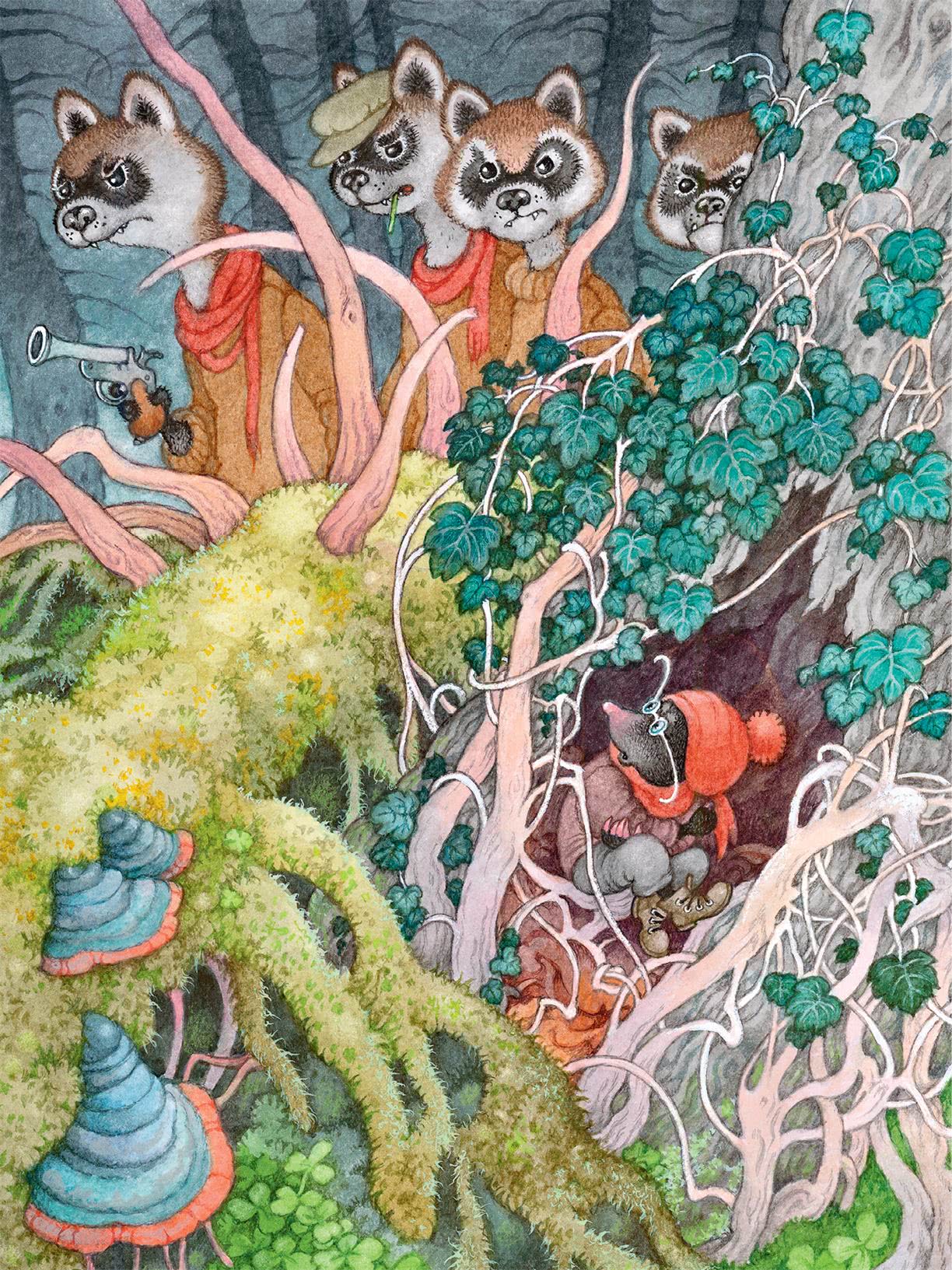 Дядюшка Рэт вышел из дома и тщательно обследовал размокшую поверхность земли, надеясь найти его следы. Следы, конечно, отыскались. Галоши были новые, остренькие пупырышки на подошвах ещё не стёрлись. Он видел их отпечатки в грязи, ведущие прямо в сторону Дремучего Леса. Минуту-другую дядюшка Рэт постоял в задумчивости. Вид у него был очень мрачный. Потом он вернулся в дом, обвязался ремнём, сунул за него пару пистолетов, взял в руки дубинку, которая стояла в прихожей в углу, и быстрыми шагами двинулся по Кротовым следам.
