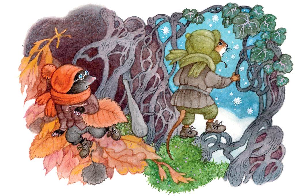 Действительно, всё кругом изменилось до неузнаваемости. Крот ни за что бы не догадался, что это тот же самый лес. Но делать было нечего, и они отважно двинулись в путь, выбрав направление, которое казалось наиболее обещающим. Они шли, держась за лапы и подбадривая себя тем, что оба притворялись, будто узнают старого друга в каждом следующем дереве, мрачно и молча их приветствовавшем. Или находили полянки, прогалины и тропинки с якобы знакомым изгибом, который перебивал монотонную одинаковость белизны и древесных стволов, упрямо отказывавшихся отличаться друг от друга.