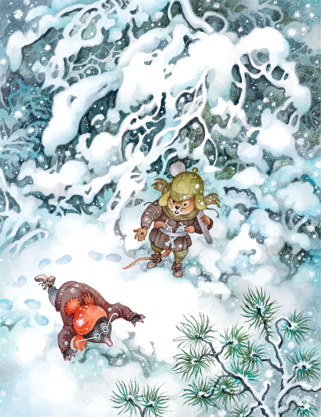 Но дядюшка Рэт, после того как крепко стянул ранку платком, не обращая внимания на Крота, стал изо всех сил раскапывать снег. Он разгребал его, копал, расшвыривал всеми четырьмя лапами, а Крот взирал на него нетерпеливо, время от времени вставляя: