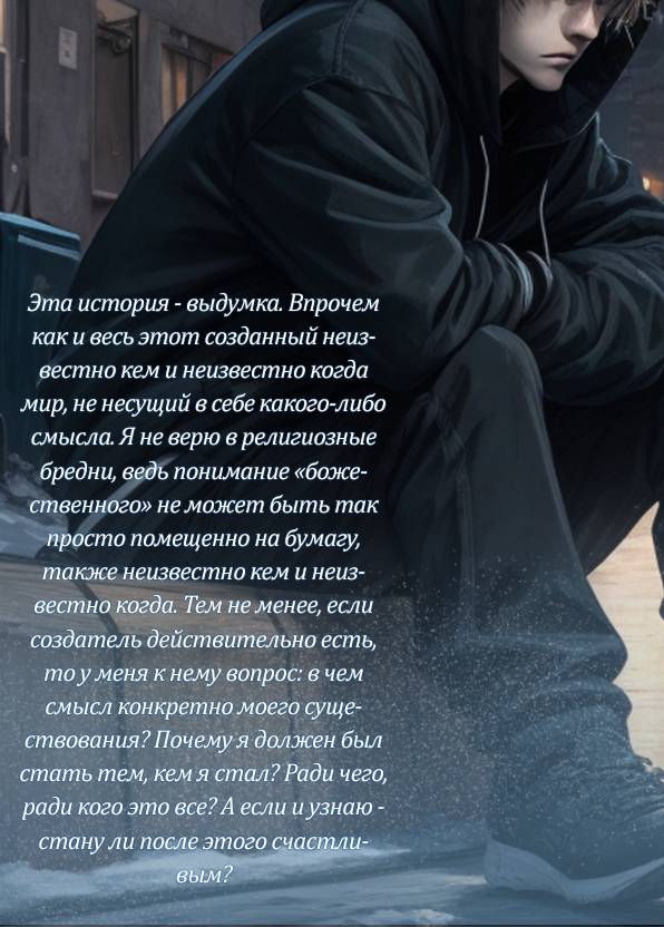 «На что я рассчитывал вообще, сбежав вот так из дому в такое время?». Внезапно эта мысль заняла все свободное пространство в моей голове. А ведь точно – столь вспыльчивое поведение, да и к тому же мама ни в чем не виновата… Веду себя, как ребенок. Надо скорее возвращаться, но почему-то не могу. Наверное, меня вновь гложет это необоснованное чувство вины. То самое, возникающее просто на ровном месте, когда решаешь посвятить лишнюю минуту себе одному вместо того, чтобы закрывать пробелы в учебе, когда не можешь отказать в помощи тупым сверстникам – когда твоей вины нет, но ты все равно терзаешь себя изнутри.
