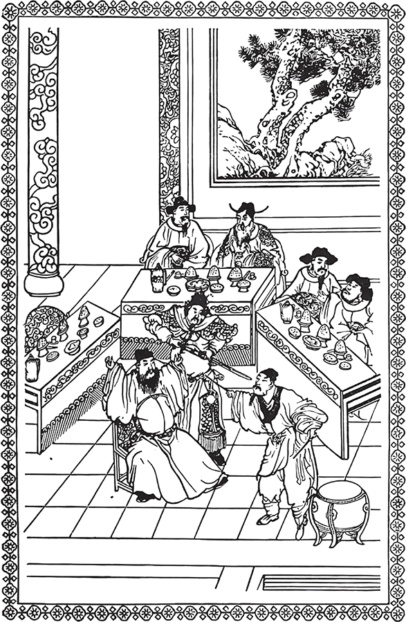 Однажды вечером, когда Цзи Пин откланялся, собираясь уходить, Дун Чэн попросил его остаться поужинать. Они пили вино до часа первой стражи, и Дун Чэн от утомления задремал. Вдруг доложили, что пришел Ван Цзы-фу со своими друзьями. Дун Чэн вышел встречать их.