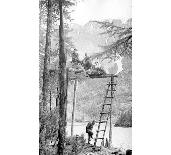 Была еще и весновка, когда Башлавин попросил меня сделать два лабаза на новом полевом лагере. И я сделал, по типу тех, что видел у него на прежнем лагере. А сделав, я опилил края жердей, чтобы не торчали и, также, для красоты.