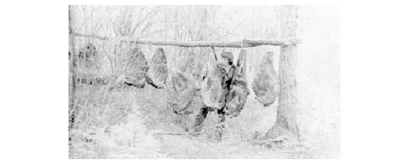 Хранили мы мясо по разному: у Шульгиной засаливали в фанерные бочки из под сухой картошки или в молочных флягах, ставя их на мерзлоту; у Башлавина складывали в большой брезентовый баульный мешок и, привязав веревкой, бросали в ручей на глубокое, но проточное место; у Осташкина – подвешивая на слеге в тени, но на ветерке, мясо как бы запекалось и не кровоточило.