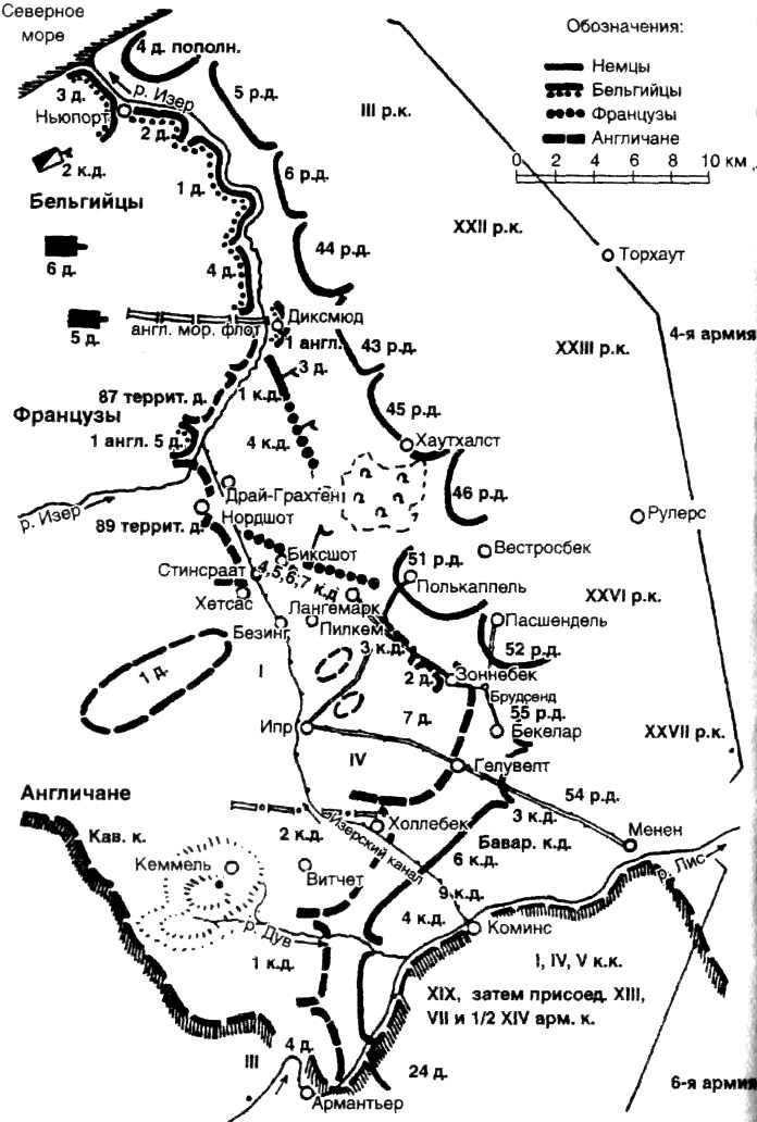 Сотни тысяч добровольцев стянулись под наши знамена во время мобилизации: тут были и юноши, исполненные энтузиазма, и зрелые мужчины, готовые на любую жертву, какая только могла от них потребоваться. Тотчас же после наскоро проведенного обучения, которое редко длилось более шести недель, их спешно отправляли на разные фронты в составе новосформированных корпусов и дивизий. Новая 4-я армия была составлена из XXII, XXIII, XXVI и XXVII резервных корпусов, к которым добавились III резервный корпус, 4-я дивизия (пополнение) из Антверпена, которая уже побывала в боях, и довольно мощное по меркам того времени тяжелое артиллерийское вооружение. 17 октября армия отошла от своего исходного рубежа, протянувшегося от Брюгге на восток до Куртре, и двинулась к рубежу реки Изер между Ньюпортом и Ипром. И еще никогда ни один германский солдат не шел в битву с таким пылким энтузиазмом, как шли эти ребята в составе своих молодых полков.