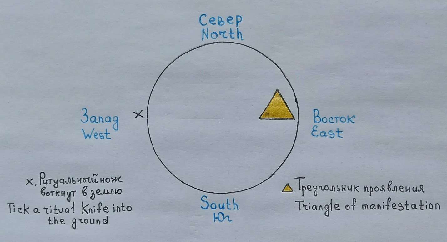 В форме Магического круга построены священные храмы всех религий мира. Треугольник проявления находится на Востоке. Вызываемая Сила проявляется в треугольнике. На Западе от круга воткнут нож, меч, кинжал или шампур . Пять Архангелов Судьбы, Дхиани Будд , Богов кармы, появляются над крылатыми дисками в центре. Противостоящая Ритуалу демоническая сила, концентрируется на острие, воткнутом ноже в землю на Западе, мелкие астральные сущности кроме того бегают за границей круга.
