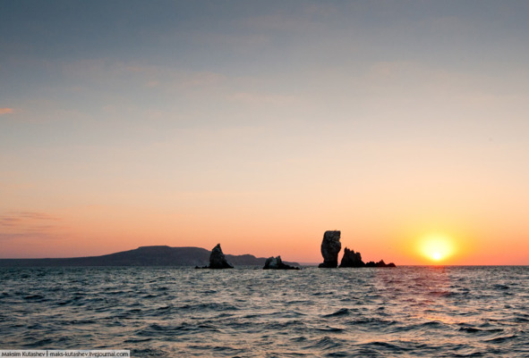 В Тихой бухте сонно и умиротворенно, толпы отдыхающих появятся позже, а палаточники еще спят. Небо над горой Кучук-Енишар на глазах наливается рыжим светом, но вы успели. Осталось лишь сбежать по откосу к пляжу, сбросить шорты с майками и остановиться у линии прибоя, любуясь тем, как под лучами встающего за спиной солнца море играет оттенками синего цвета. А мыс Хамелеон, шут и паяц, младший брат Старого дракона – Карадага, начинает в первый раз за день менять оттенок своей шкуры.