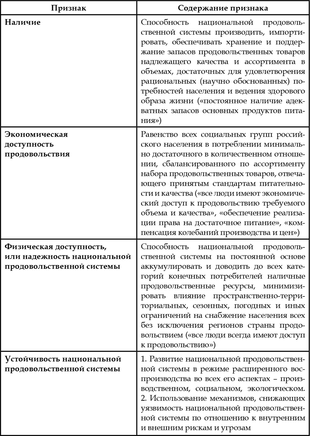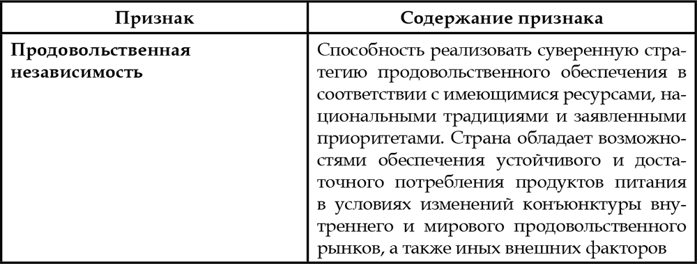 Таблица 1.1 – Критериальные признаки продовольственной безопасности