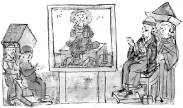 Показ греческим философом занавеси с изображением Иисуса Христа Владимиру Святославичу. Миниатюра из Радзивилловской летописи