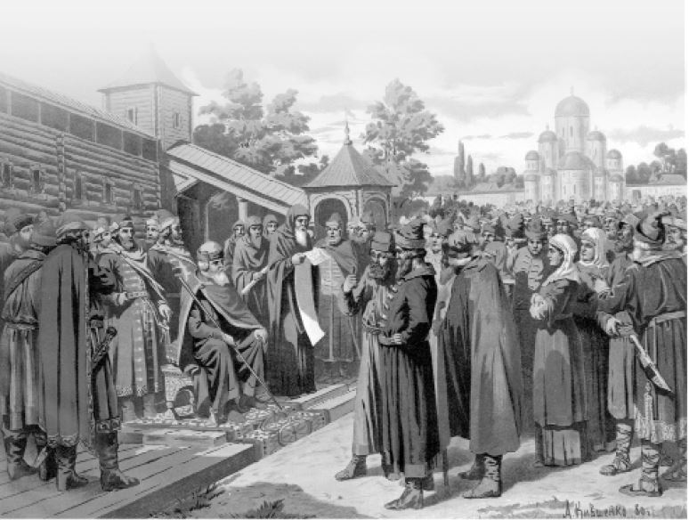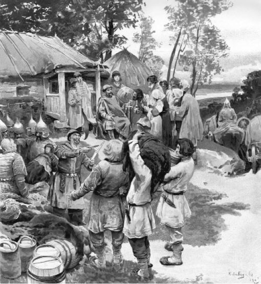 От решения этого вопроса зависели и судьбы сыновей Святослава, потому что в Древней Руси существовал очень жестокий обычай. Людей, в чем-либо провинившихся, «изгоняли из жизни», то есть лишали их права заниматься кормившим их семью делом. Существовало три категории таких людей: попов сын, что грамоте не выучился, купец задолжавший и смерд (крестьянин), от верви (общины) отклонившийся. В какой-то степени это было справедливо. Попов сын мог наследовать приход отца, но для посвящения в сан нужно было знать грамоту и уметь служить литургию. Если из-за лени попович грамоту не разумел, его из прихода изгоняли. Сам виноват, скажем мы, надо было учиться. Виновным считался и не отдавший долг купец: «взял в долг – верни». Был ли ограблен караван, потопила ли буря ладьи с товаром или купец попросту промотал чужие деньги – все это считалось вопросом праздным. Точно так же смерда, отколовшегося от своей верви, где его знали родственники и соседи, не принимали жить и работать другие общины, не интересуясь причинами изгнания.