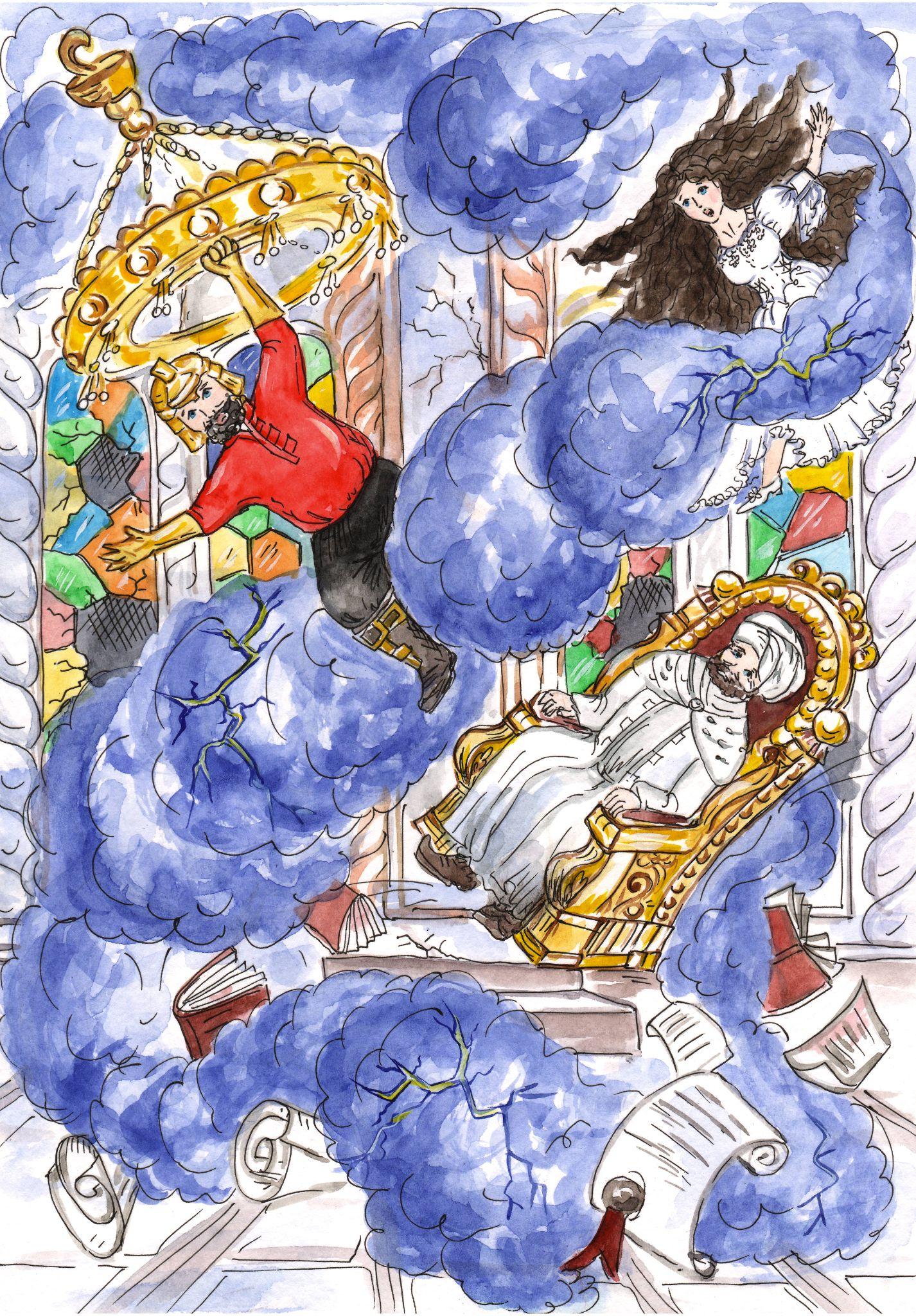 Лерия пыталась вырваться и кричала. Чарагим бегал за ней, но не мог поймать. Поднялся ветер. Да такой силы, что разметал все книги, выбил все окна! Писари завизжали и разлетелись по углам. Царь сидел на троне с открытым ртом. И не шевелился. Синяя змея становилась всё шире и длиннее и наконец заполнила огромный зал от пола до потолка. От стены до стены. И в этом синем тумане залетало всё. Даже трон царя. Даже люстра с вцепившимся в неё Чарагимом.