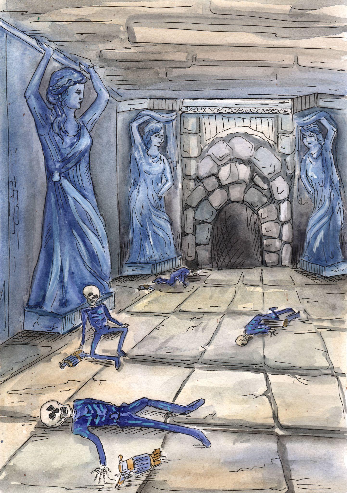 Потолок там держали невероятных размеров синие статуи женщин с серьёзными, напряжёнными лицами.