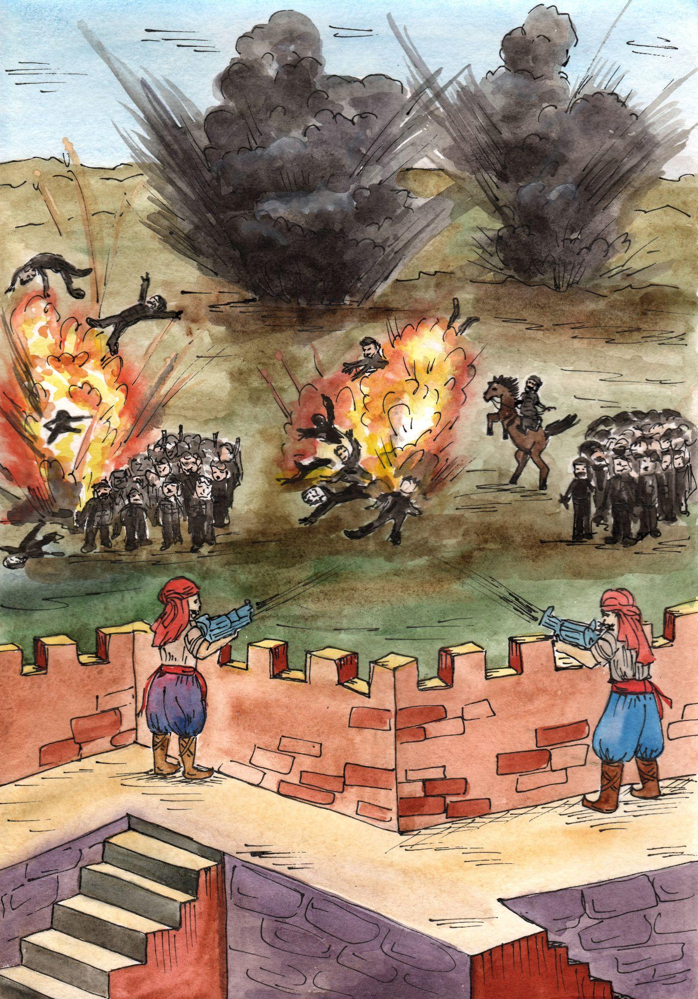 Это стреляли четырнадцать храбрецов из чудо-оружия. После первых выстрелов они все оглохли, но продолжали палить в чёрное войско, которое пыталось штурмовать городские ворота.