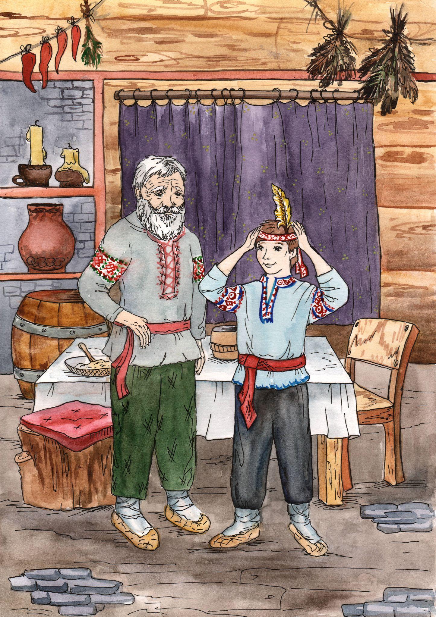 Доброслав со слезами на глазах протянул внуку белую налобную повязку, расшитую красным узором. К ней крепилось красивое золотое перо.