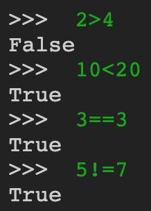 These symbols are called comparison operators in Python. And we need them to let our program compare different data, for instance: numbers, strings, variables, etc.