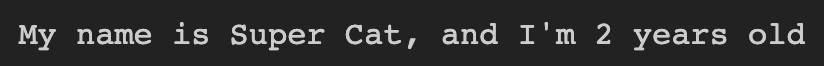 1) We created a placeholder in our string. You can identify it by the curly brackets – {}. This placeholder is for the age of the Super Cat, which has a numeric value.