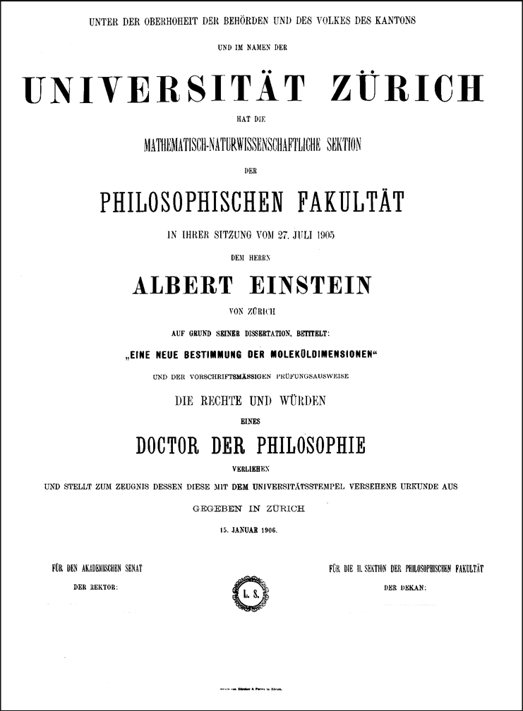 Диссертация А. Эйнштейна «Новое определение размеров молекул», датированная 15 января 1906 г., на соискание степени доктора философии.