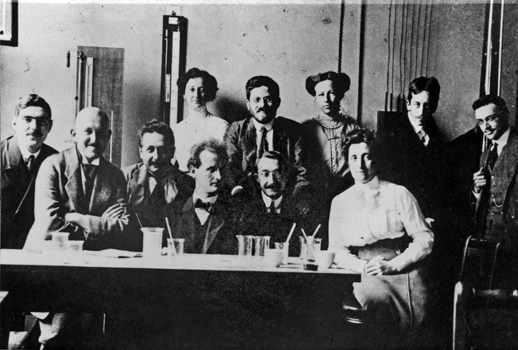 Коллеги А. Эйнштейна по физической лаборатории цюрихского Политехникума. Слева направо: Карл Херцфельд, Отто Штерн, Альберт Эйнштейн, г-жа Франкамп, Огюст Пиккар, Пауль Эренфест, Рене Фортра, г-жа Бруэн, г-жа Гиргорьева, Габриэль Фёкс, г-н Вольферс.