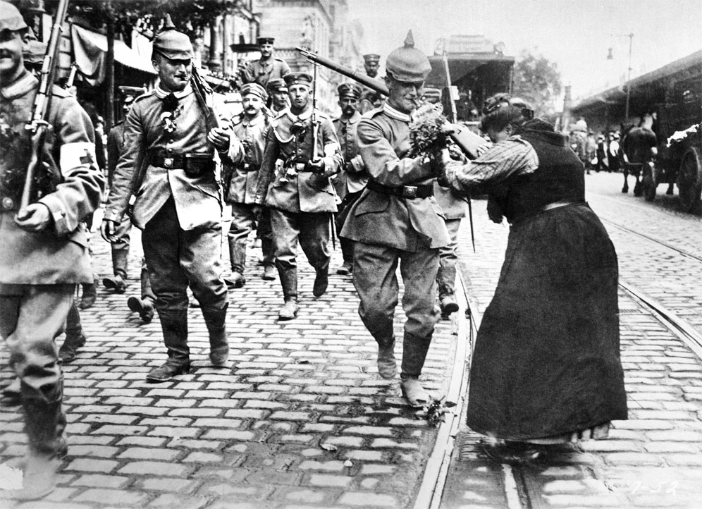 Женщина вручает цветы уходящему на фронт солдату. Берлин, август 1914 г.