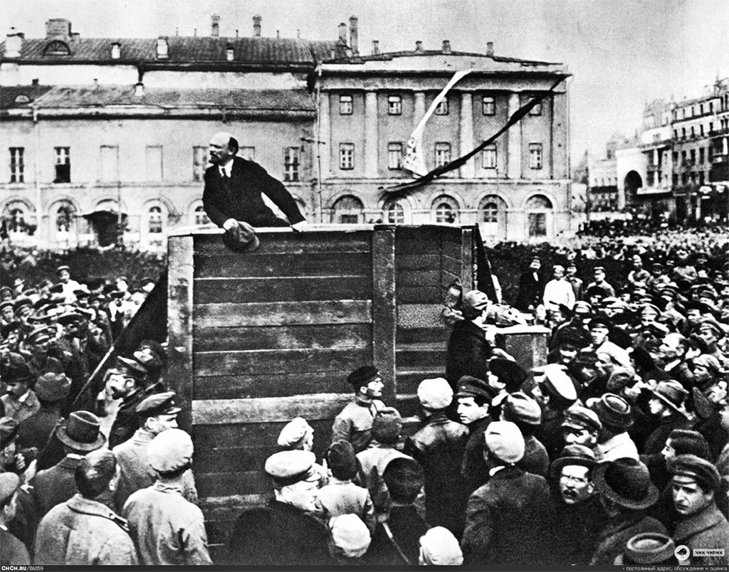 Ленин выступает на Красной площади перед солдатами, отправляющимися на фронт в Польшу. Май 1920 г. У подножия импровизированной сцены стоят Троцкий и Каменев.