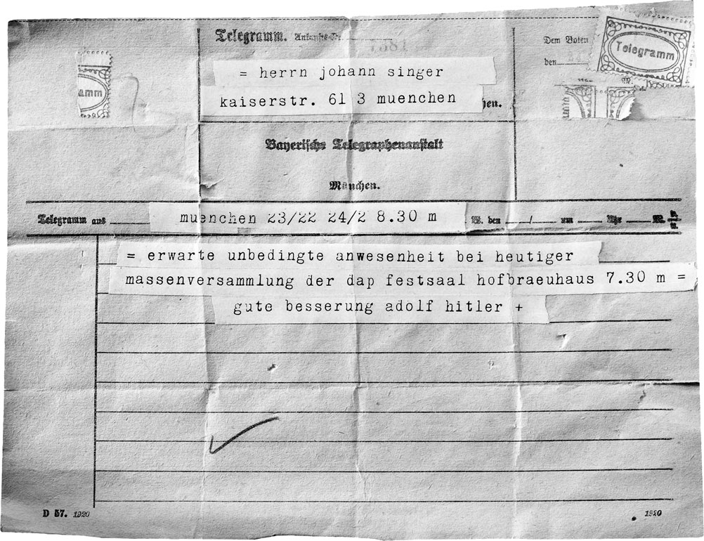 Телеграмма Адольфа Гитлера, где он настаивает на присутствии Зингера на партийном мероприятии. 24 февраля 1920 г.