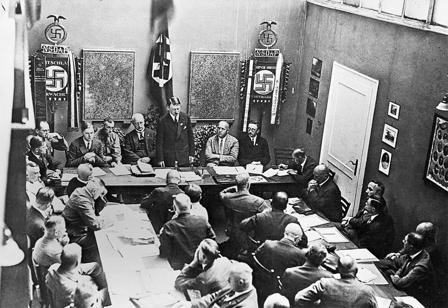 Гитлер на встрече иерархической верхушки партии НСДАП. Слева от него сидят Штрассер, Гиммлер и Розенберг. Середина 1920-х гг.