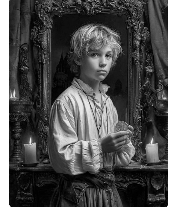 Когда свечи вновь загорелись, комната была пуста, в ней стояло старинное высокое Зеркало в удивительной раме, его мерцающая гладь была спокойна, на полу, у ножки, лежала монета. Зеркало молчало…