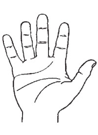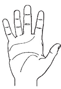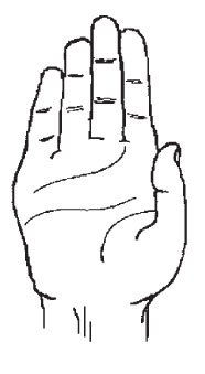 Прежде чем рассматривать основные хиротипы, поговорим о том, как подразделять человеческие ладони на чувствительные и прагматические. В основе такой классификации лежат два фактора: форма ладони и относительная длина пальцев. Прагматические ладони имеют одинаковую ширину и длину, т. е. в отпечаток руки на бумаге может быть легко вписан квадрат (рис. 2). Ладони чувствительных рук заметно удлинены и часто сужаются от основания к кончикам пальцев, выявляя в качестве базисной геометрической фигуры прямоугольник (рис. 3). Определять форму ладоней можно непосредственно на руке человека, воспользовавшись линейкой, рулеткой, измерителем или циркулем. При хорошем глазомере или достаточной хиромантической практике это можно легко проделывать и без каких-либо вспомогательных средств, т. е. «на глазок». Как следует из названия, обладатели чувствительной ладони отличаются романтическим взглядом на жизнь, и отношения между половыми партнерами эмоциональны и восприимчивы. Эмоциональные вспышки особенно характерны для владельцев удлиненной ладони, имеющей несколько коническую форму.