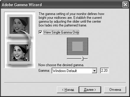 Для этого служит, например, небольшая, но очень удобная программа Adobe Gamma. В крайнем случае воспользуйтесь утилитой калибровки, которая обычно устанавливается вместе с драйвером видеосистемы. Для этого откройте окно свойств экрана (с помощью меню Пуск → Настройка → Панель управления →Экран), перейдите в нем на вкладку Параметры и нажмите кнопку Дополнительно. Откроется окно с несколькими вкладками. Их названия зависят от того, какие драйверы видеокарты установлены. Найдите такую, в названии которой есть слова Gamma, Calibrate, Управление цветом или что-то подобное. Скорее всего, вы получите возможность настроить цвет с помощью оригинальной разработки компании – создателя видеокарты. Принцип действия везде похожий (мы рассмотрим его на примере Adobe Gamma), а вот интерфейс может заметно различаться.