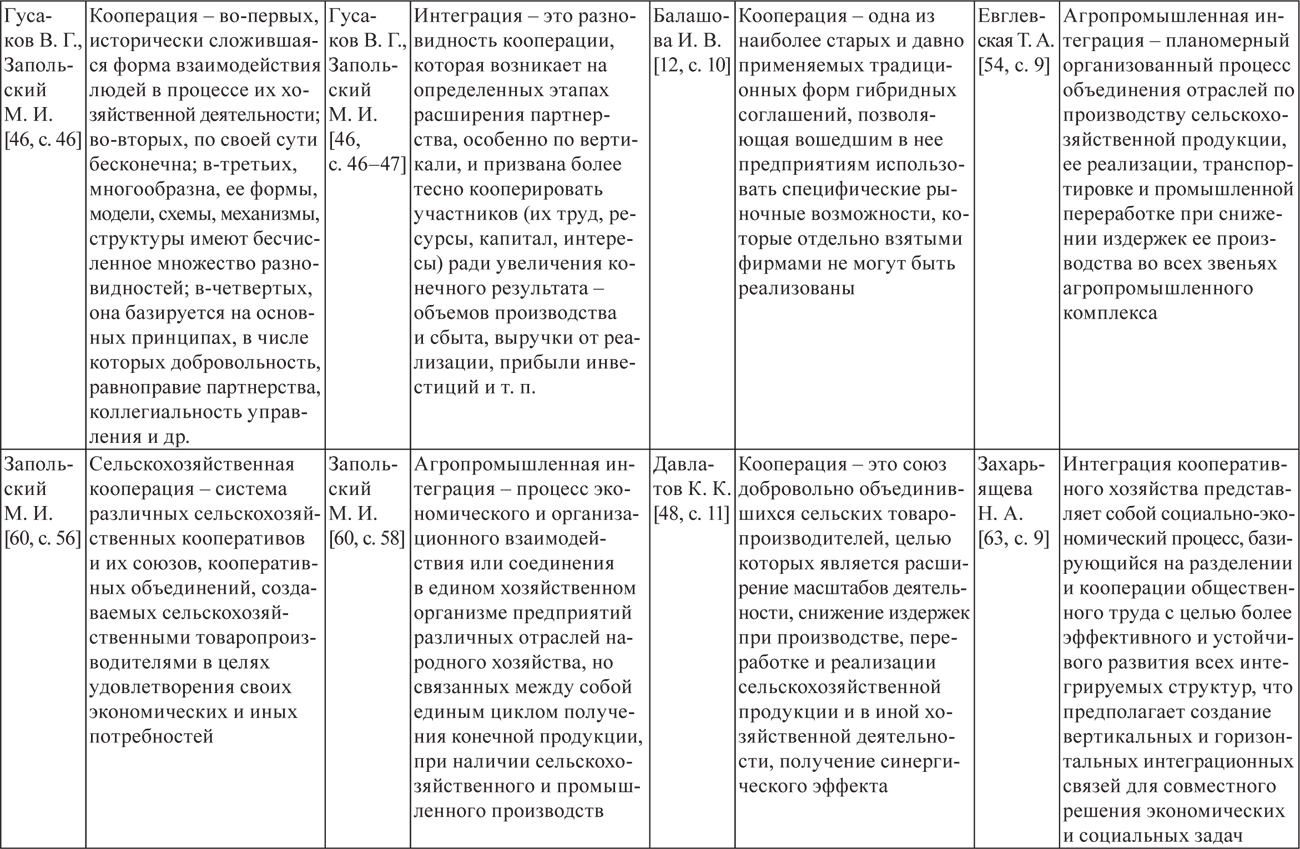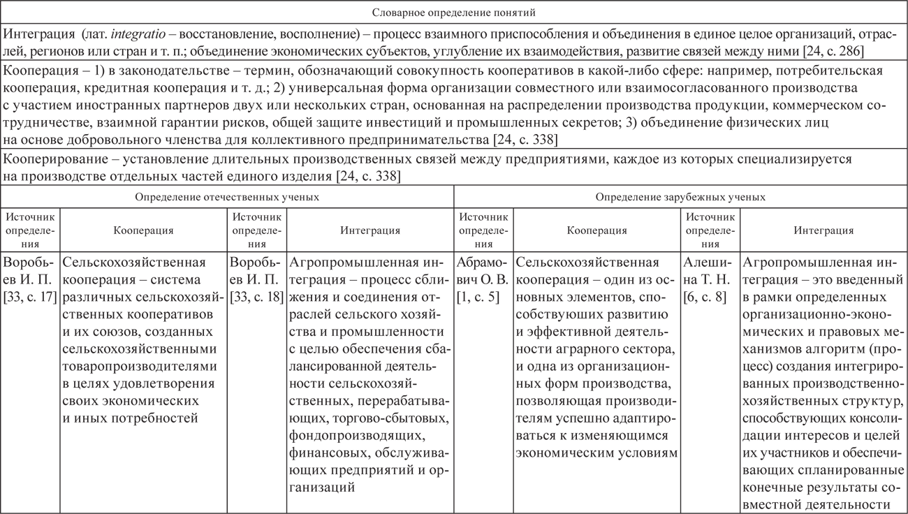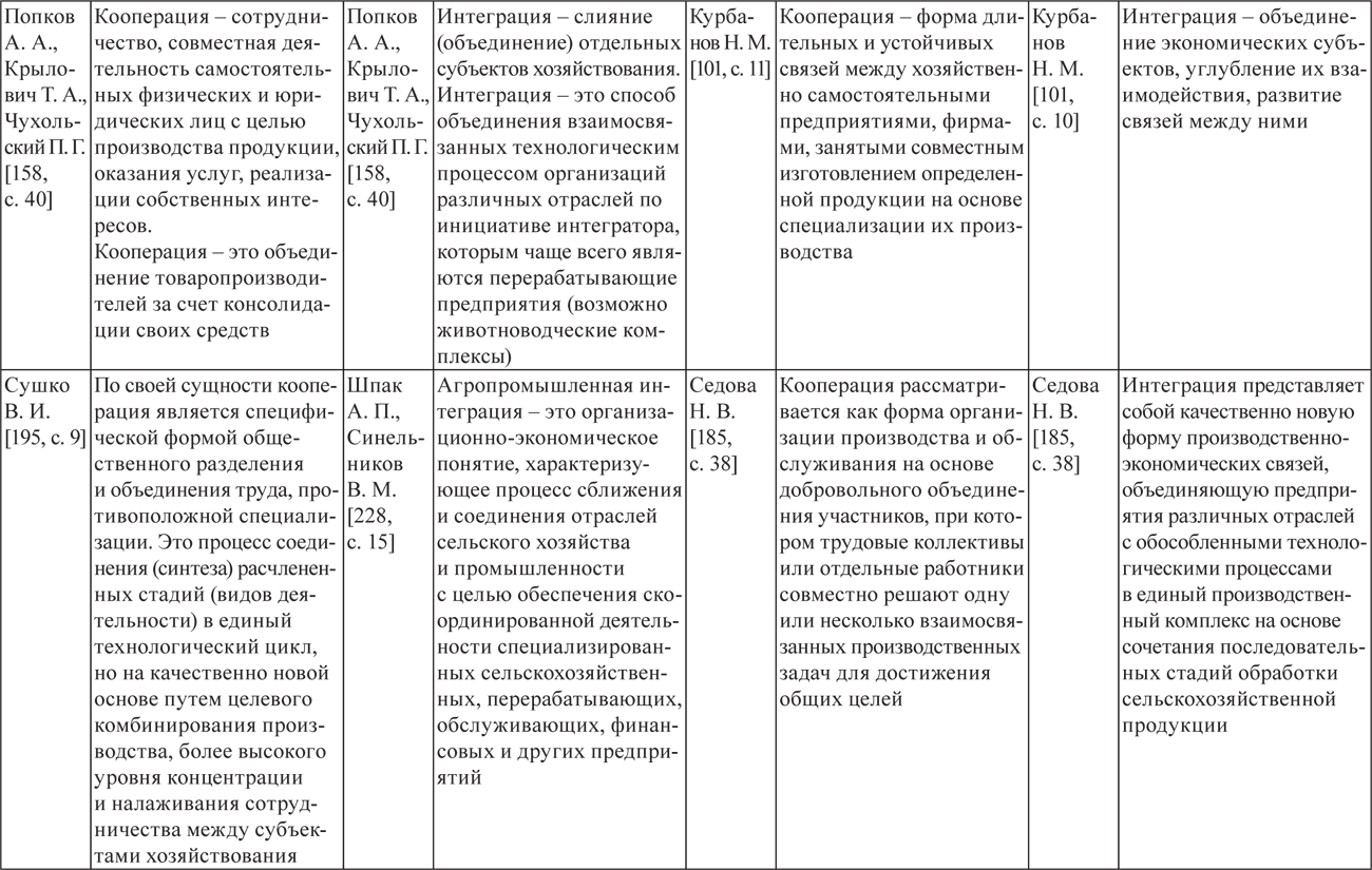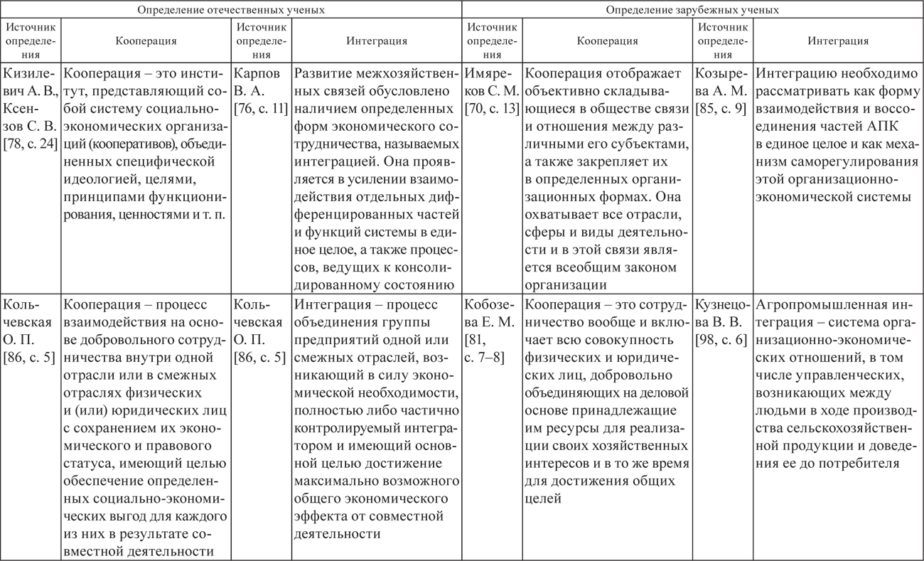 Вместе с тем в практике применения терминологии кооперации и интеграции и особенно при практическом взаимодействии субъектов хозяйствования зачастую наблюдается непонимание их отличительных черт. Исходя из этого для раскрытия сути представляется целесообразным выполнить детальный анализ понятий кооперации и интеграции применительно к новым условиям хозяйствования. В связи с этим нами был проведен сравнительный анализ понятий, содержащихся в отечественной и зарубежной литературе (табл. 1.1) [12-А].