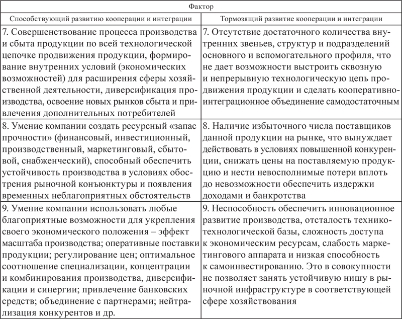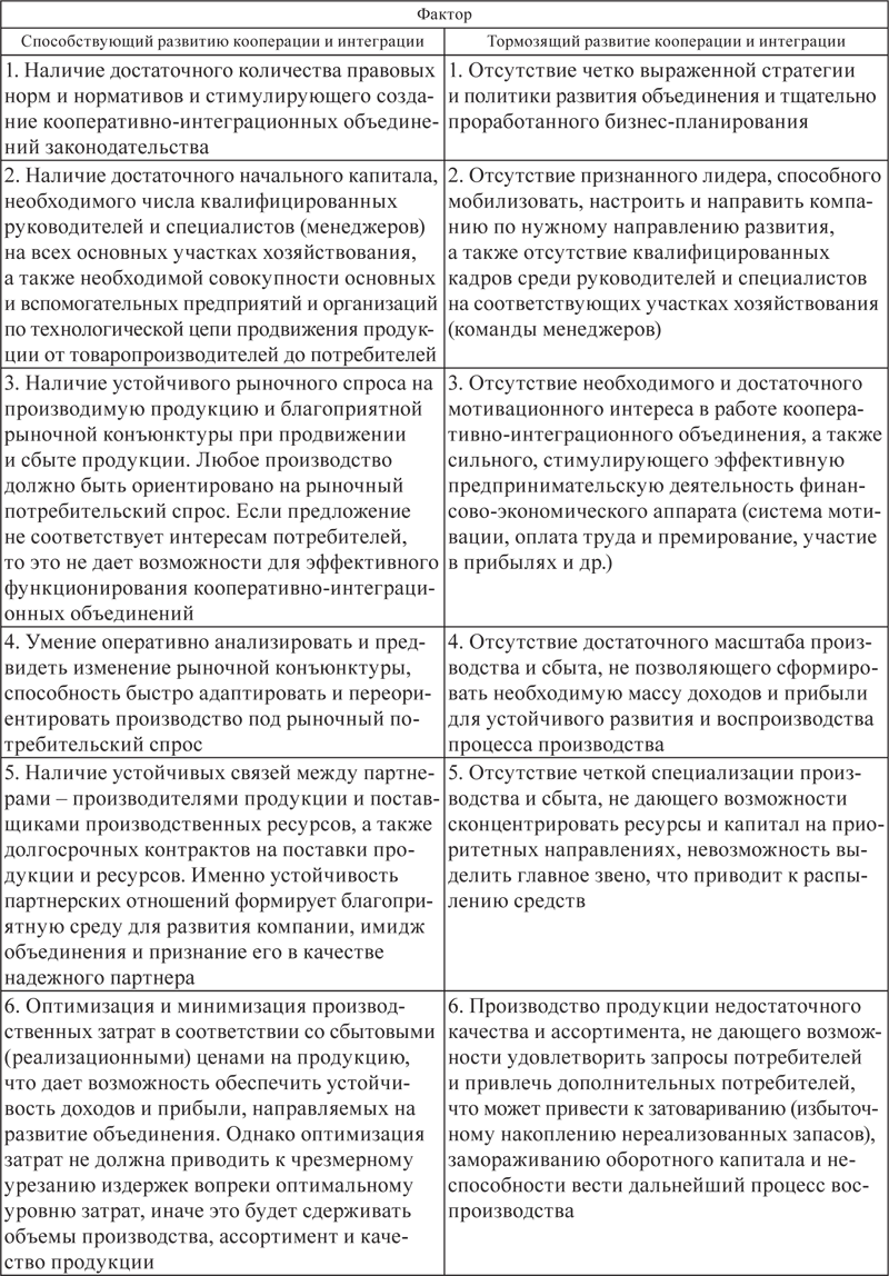 Таблица 1.2. Характеристика факторов, способствующих развитию и тормозящих развитие кооперации и интеграции
