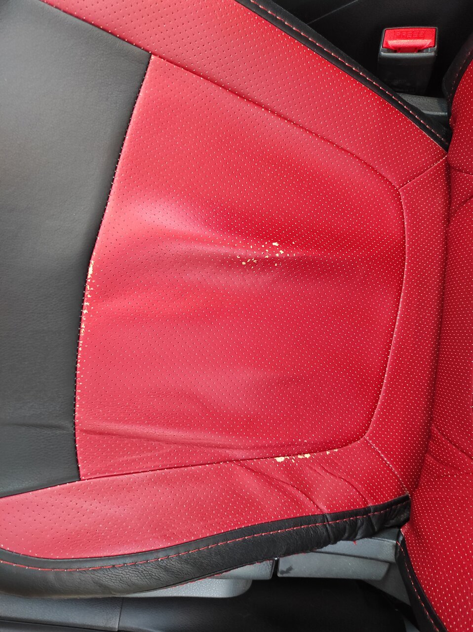 Места, где вы сидите (в первую очередь, конечно, водительское сиденье), сильно протираются. При сидении вы совершаете микродвижения, т.е. простым языком – ерзаете. Именно это разрушает верхний полимерный слой экокожи.