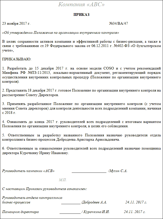 Положение по организации внутреннего контроля и будет являться для персонала нормативным актом, регулирующим процесс проведения внутреннего контроля, непосредственно в этой компании. При этом в целях его соблюдения всеми сотрудниками необходимо получить их подписи об ознакомлении с этим документом.