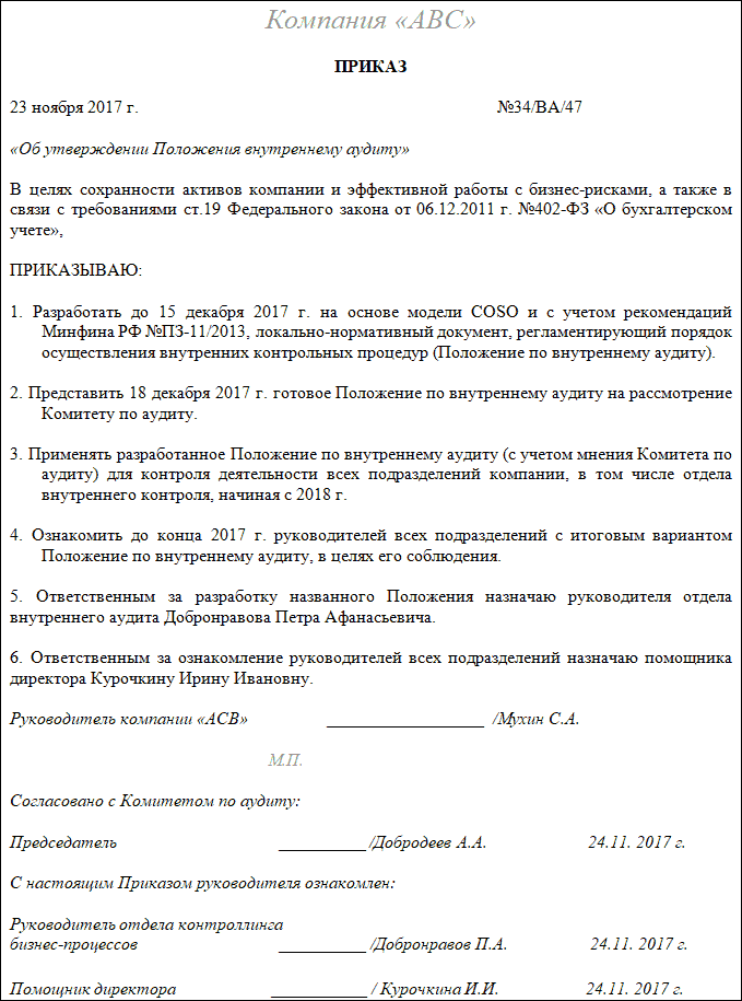 Образец Приказа об утверждении Положения по внутреннему аудиту представлен ниже на рисунке 4.
