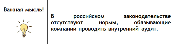 На сегодняшний день в российском законодательстве отсутствуют нормы, обязывающие компании проводить внутренний аудит, и регулирующие порядок осуществления соответствующих процедур.
