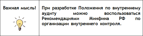 Данные рекомендации и принципы модели внутреннего контроля, разработанные COSO, могут быть использованы также и при подготовке Положения по внутреннему аудиту.