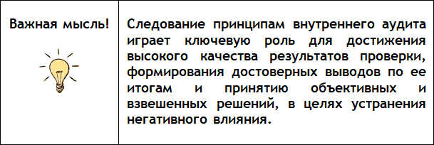 Принципы внутреннего аудита являются для внутренних аудиторов… неким сводом правил или даже заповедями, которым эти специалисты должны следовать, осуществляя проверку.