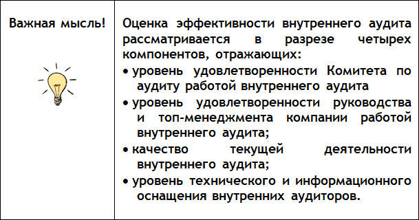 Поэтому для контроля за деятельностью внутренних аудиторов и с целью оценки эффективности используемых аудиторских процедур, в компании должны быть разработаны соответствующие критерии такой оценки.
