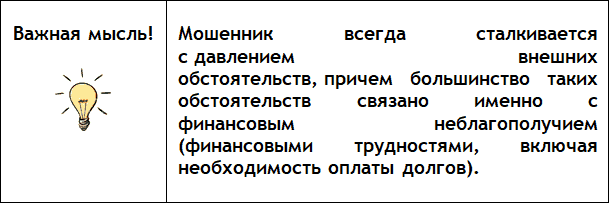 В действительности, мошенник всегда сталкивается с давлением внешних обстоятельств, причем большинство таких обстоятельств связано именно с финансовым неблагополучием (финансовыми трудностями, включая необходимость оплаты долгов).