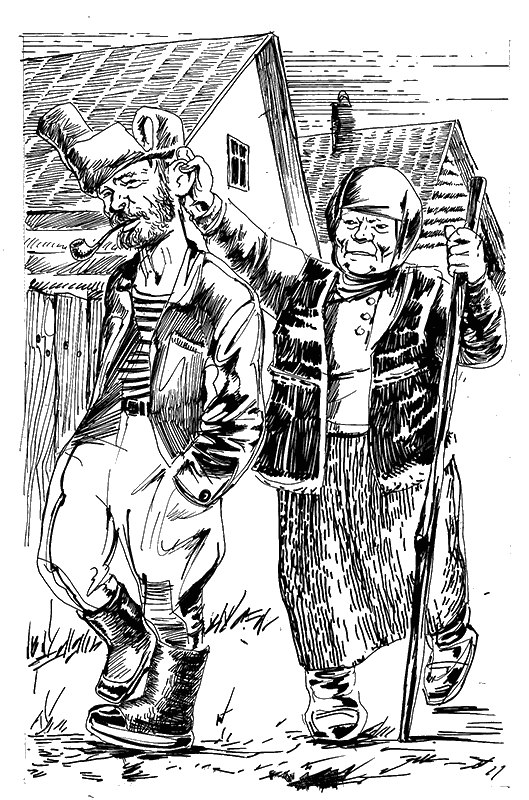«Сама» без слов взяла деда железными пальцами за ухо и потащила по улице. Дед покорно и привычно тянулся за ней, хлопая большими сапогами и дымя трубкой.