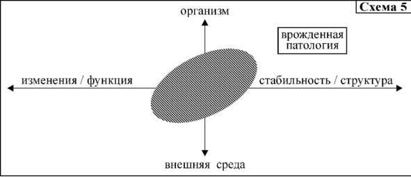 Следующая схема определяет профиль врожденных нарушений. Они как бы связаны с процессами, протекающими в самом организме и являются достаточно стабильными. Но и это, скорей всего, иллюзия. Поскольку общеизвестно, что врожденная патология вызывается внешними тератогенными факторами.