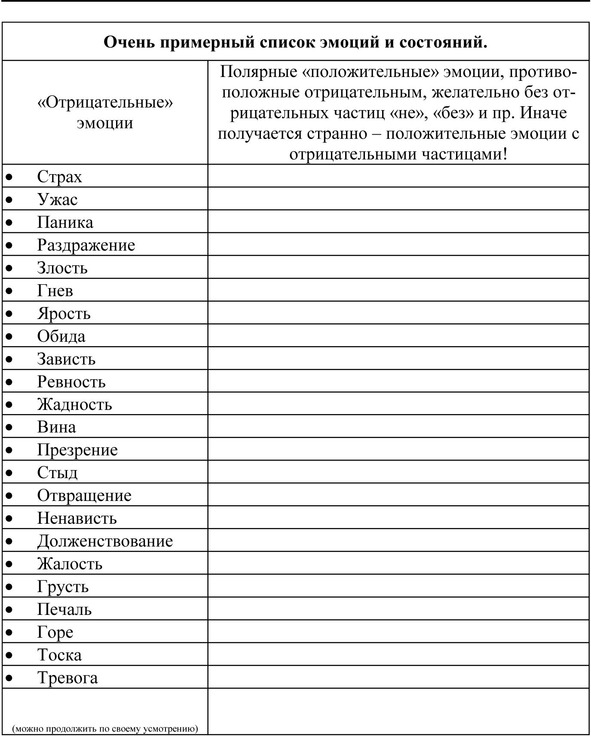 1. Усилиями всей группы составляется список отрицательных эмоций и состояний. При этом, как правило возникают спорные моменты. Не все эмоции из отрицательного списка оцениваются как отрицательные. Например, жалость и чувство долга – многие считают положительными. Однако в дальнейшем все прояснится – если эмоция сопровождается приятным ощущением в теле, значит, она положительная, если неприятным – значит, отрицательная. Социальная оценка не имеет значения.