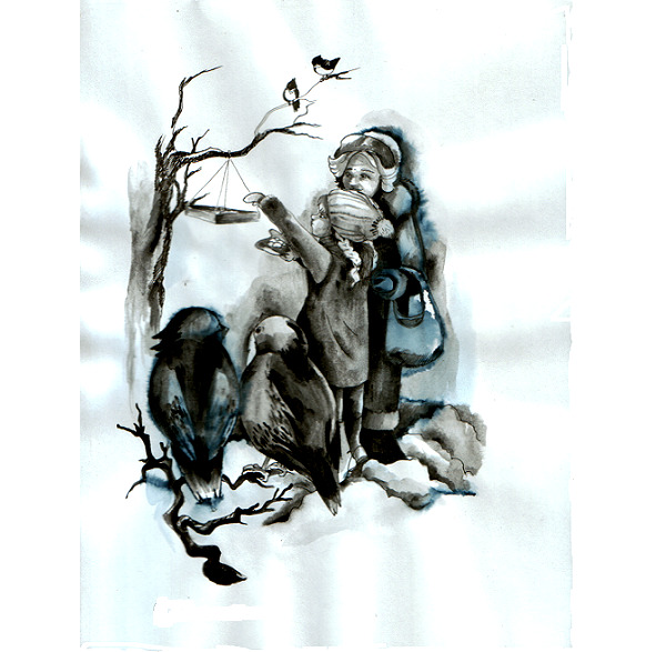 – Да, накормили снегирей, – расстроилась девочка, – сейчас сороки да голуби всё съедят. Маленьким птичкам ничего не достанется.