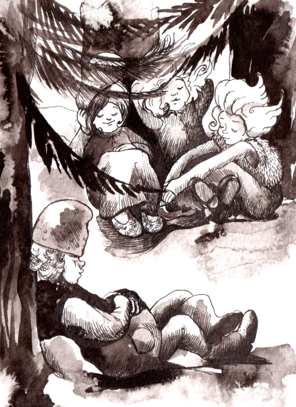 Всю ночь сестрицы и братик играли со снегом. Засугробили дворы. Замели снегом дома до самых крыш. Под утро устали и вернулись к себе в чащу лесную. Разлеглись под ёлками. Отдыхают, силу набирают.
