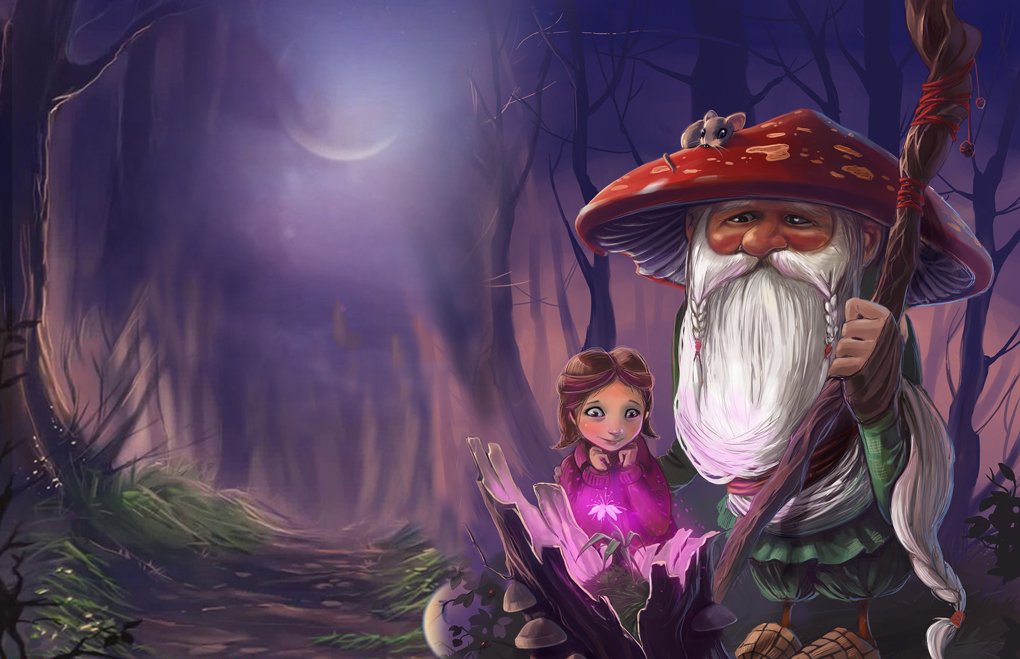 Неожиданно из-за деревьев появился худой старичок. На плече у него сидел большой филин, на голове была шляпа из мухомора, а густая длинная борода была заправлена в штаны.