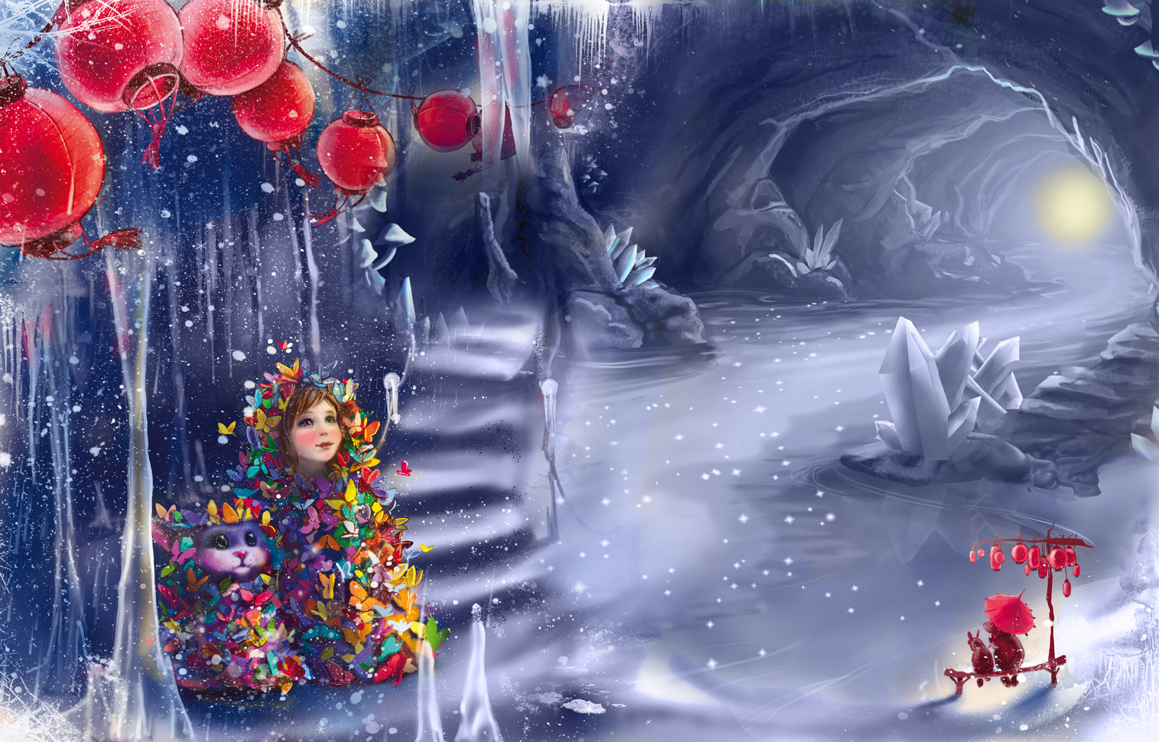 Не успела девочка опомниться, как тут же оказалась со своим другом в этой самой пещере. Здесь было так холодно, что даже пар шел изо рта, но костюмы из бабочек надежно согревали друзей.