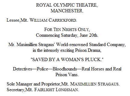 "My employer, as doubtless you are very well aware, Mr. Ebridge, is one of the largest theatrical entrepreneurs in England. His dealings are gigantic. And it is the business connected with one of those enormous productions that brings us here. In the first place, you must know that, on the third Saturday in this present month, he has arranged to produce the entirely new and original drama, "Saved by a Woman's Pluck," at the Royal Olympic Theatre, Manchester. By the way, have you the preliminary poster with you, Mr. Stragaus?"