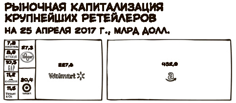 Покупать Porsche Panamera Turbo S или новую пару кружевных туфель от Louboutin – интересно, а вот зубную пасту и экологичные подгузники – скучно. Amazon, самое востребованное в США и набирающее популярность в мире предприятие розничной торговли в интернете, облегчает нам монотонное дело – приобретение жизненно необходимых товаров[1], [2]. Теперь от нас не требуется больших усилий: не надо быть охотником, можно стать только чуть-чуть собирателем и кнопконажимателем. Секрет Amazon кроется в небывалых вложениях в инфраструктуру «последней мили»[3], которые стали возможны благодаря необычайно щедрому кредитору, а именно инвесторам в розничную торговлю, ставшими свидетелями наиболее увлекательного и в то же время простого сюжета в бизнесе – рождения самого большого магазина в мире. Этот сюжет был спланирован так же тщательно, как и высадка в Нормандии[4] (с поправкой на то, что на кону все-таки не судьба мира и героическое самопожертвование мы вряд ли увидим). Результат – ретейлер, который стоит дороже Walmart, Target, Macy’s, Kroger, Nordstrom, Tiffany&Co, Coach, Williams-Sonoma, Tesco, Ikea, Carrefour и The Gap вместе взятых[5].