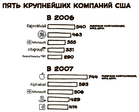 Складывается впечатление, что накопление экономической ценности «Четверкой» не подчиняется закону больших чисел и лишь ускоряется со временем. За четыре года, с апреля 2013-го по апрель 2017-го, стоимость «Четверки» выросла примерно на 1,3 трлн долларов, что сравнимо с ВВП России[27], [28].